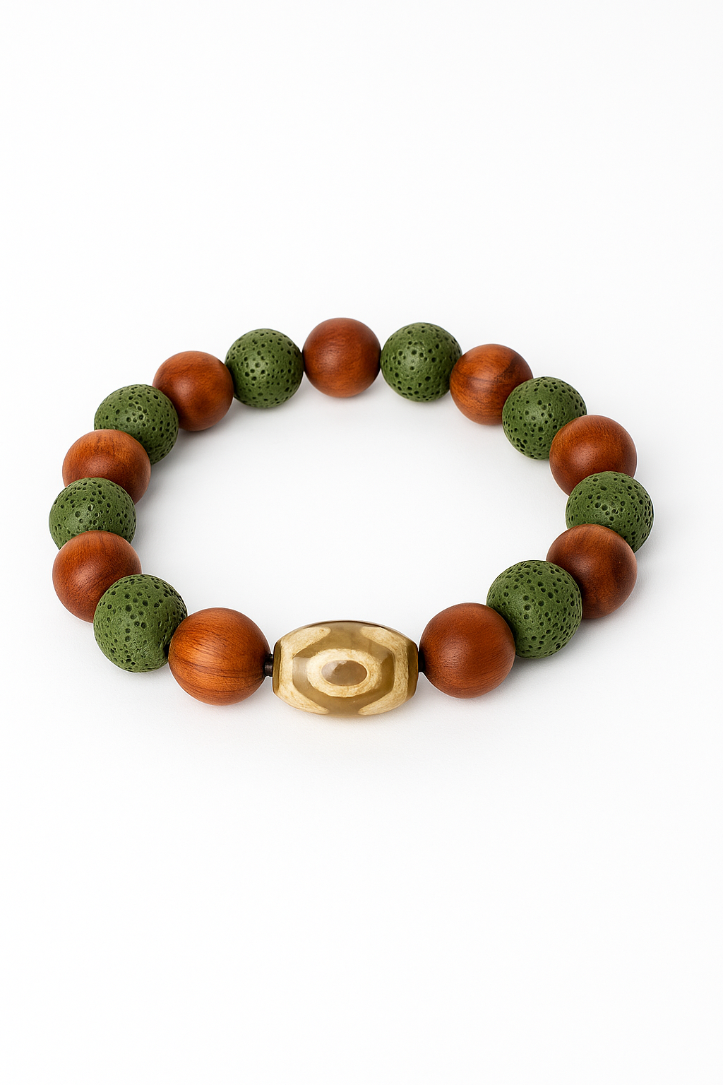 Pulseira de madeira, pedra vulcânica e Ágata 8mm